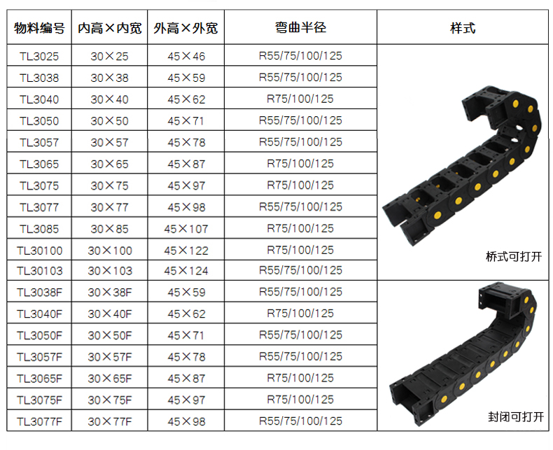 TL塑料拖鏈分為一體式(不可打開)、橋式/半封閉(內側可打開)和加強型(內外側均可打開)三種。