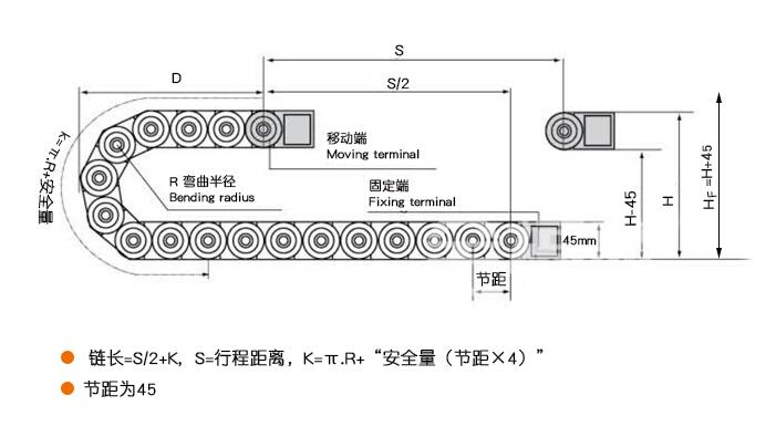 拖鏈長度確定公式:L=LA/2+b+DPJ ( L=拖鏈長度 LA/2=1/2行程 b=曲線長度 )