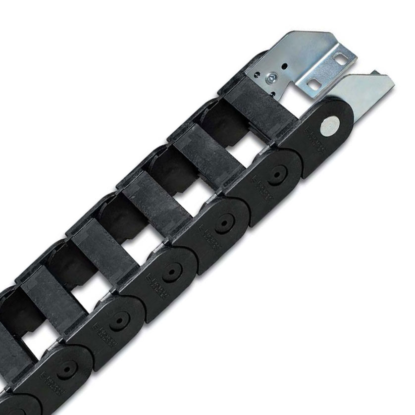 尼龍拖鏈端部連接頭端部連接頭裝置允許拖鏈的兩端都與設備相連。 端部連接頭的電纜夾和行程中點的限位器可以根據需要提供。