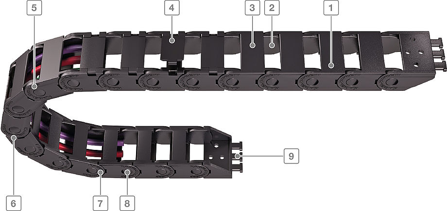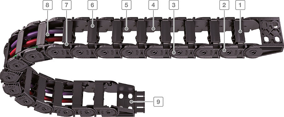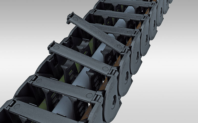 打開式塑料拖鏈每節(jié)都能打開,裝拆方便,不必穿線,打開蓋板后即可把電纜、油管、氣管等放入拖鏈內(nèi)。